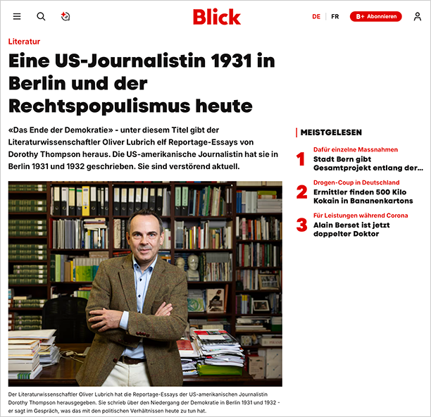 Artikel über die von Oliver Lubrich herausgegebenen Reportagen Dorothy Thompsons in der Zeitung „Blick“.