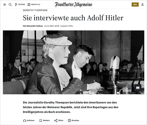 Artikel über die von Oliver Lubrich herausgegebenen Reportagen Dorothy Thompsons in der „FAZ“, online und in der Printversion.